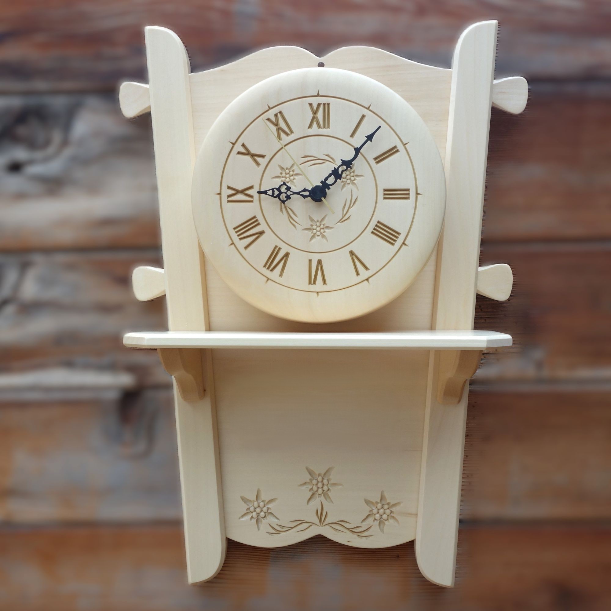 Schnitzerei: 3 Edelweiss und Edelweisskranz im Zifferblatt